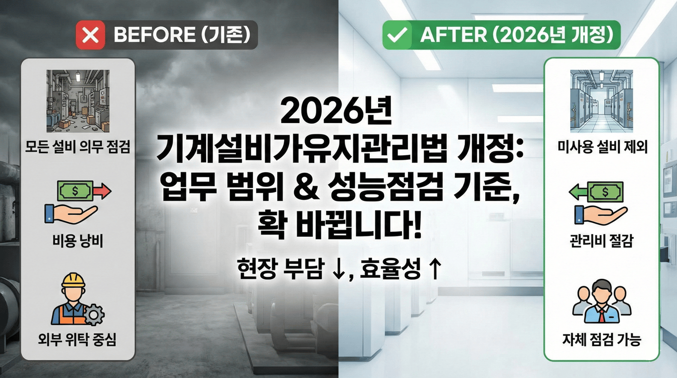 2026년 기계설비유지관리법 개정은 단순한 법령 변경이 아닙니다. 관리비 산정, 용역 계약, 인력 운영 등 실무의 핵심 요소가 모두 바뀝니다. 이번 글에서는 달라지는 비용 산정 방...