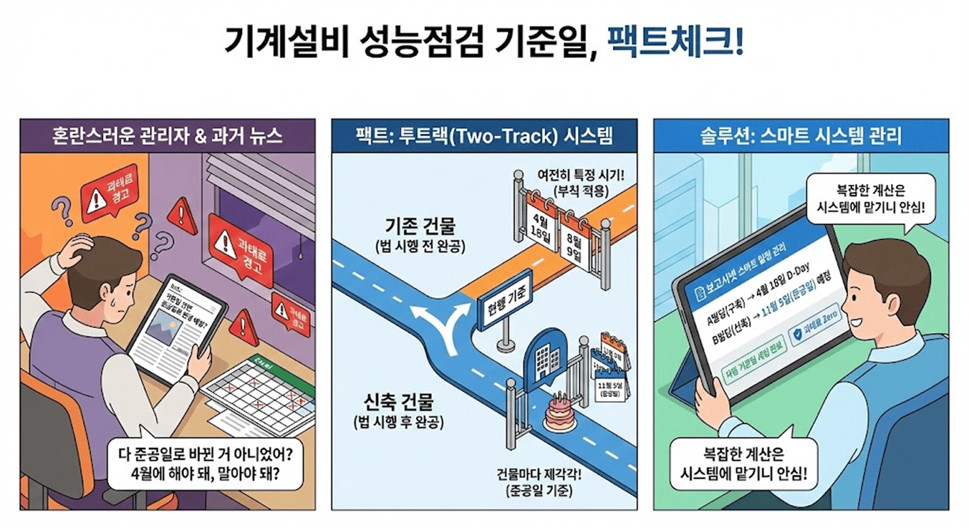 "뉴스에서 성능점검 기준일이 '준공일'로 바뀐다고 하던데, 우리 건물도 해당하나요?" 최근 관리 현장에서 가장 많이 묻는 질문 중 하나입니다. 4월 18일, 8월 9일 등 특정 날...