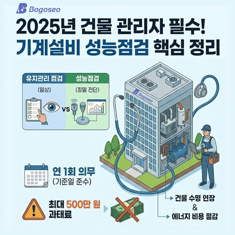 건물 관리자라면 매년 챙겨야 할 법적 의무가 늘어나고 있습니다. 그중 놓치기 쉬운 것이 바로 ` 기계설비 성능점검 '입니다. 단순히 고장 나면 고치는 것이 아니라, 법적으로 정해진...