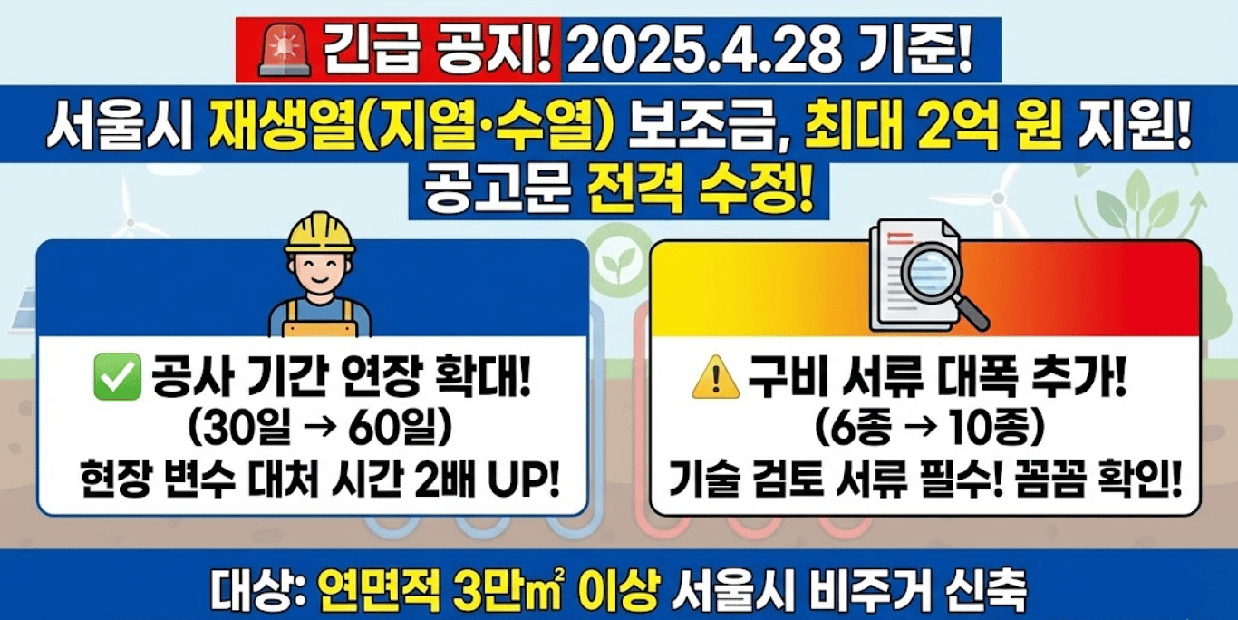 서울시 소재 연면적 3만㎡ 이상 건물을 신축 예정인 건축주 및 시공사 관계자분들 주목하세요! 서울시에서 재생열(지열, 수열 등) 설비 공사비의 15%, 최대 2억 원을 지원하는 사...