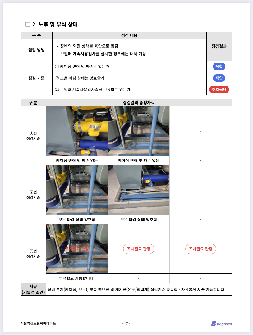 서울시 기계설비 성능점검 매뉴얼은 국토부 표준과 다릅니다. 점검문항별 사진 입력과 사유, 고유한 체크리스트 등 복잡한 요구사항을 맞추느라 고생하지 마세요. 보고서 타입을 선택하면 알아서 바뀝니다.